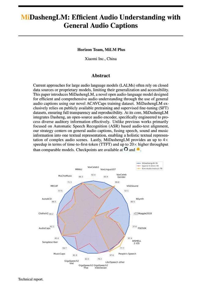 昨日,小米技术发文宣布,正式发布并全量开源其声音理解大模型 MiDashengLM-7B 模型。