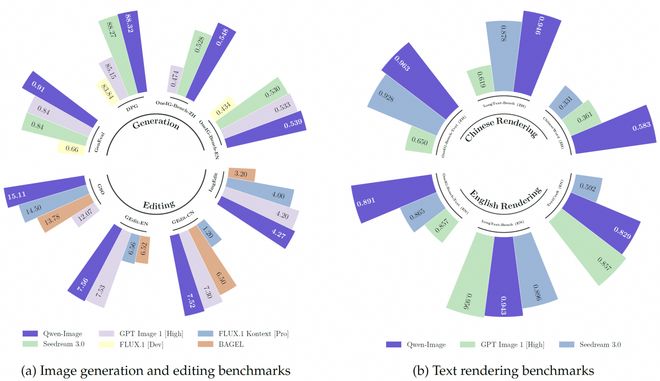 强大的跨基准性能表现: 在多个公开基准测试中的评估表明,Qwen-Image 在各类生成与编辑任务中均获得 SOTA,是一个强大的图像生成基础模型。
