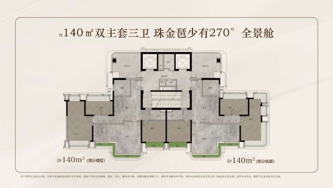 全系标配3.1-3.3米层高,迎合新出台的“好房子”标准,而且全都带有270°弧形观景窗,被称为“全景舱”户型。